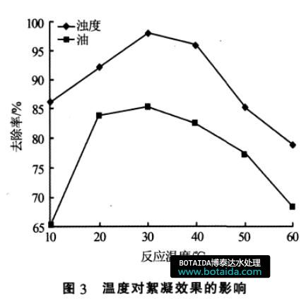 在兩種絮凝劑投加量不變的情況下, 保持水樣的pH=7,通過改變水樣的溫度,考察了水溫對于絮凝效果的影響,結(jié)果見圖3?