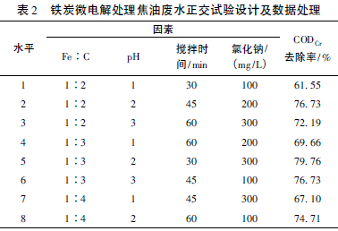 通過正交試驗(yàn),得到可以使CODCr去除率最高的最佳條件是: 鐵炭比為1∶3,pH值為2,氯化鈉投加量為200 mg/L,攪拌時(shí)間為45 min。在該條件下,焦油廢水的CODCr去除率最高,達(dá)到81. 26%。對(duì)于廢水的預(yù)處理來說,這樣的去除效果較為良好。