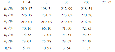 (1) 根據(jù)上表可知: 在這個(gè)正交試驗(yàn)中,四個(gè)影響因素的各個(gè)水平的3 個(gè)值中,的值均為最大。數(shù)據(jù)說明,鐵炭微電解法處理卷煙廠的焦油廢水的最佳條件組合是: Fe∶C 為1∶3;NaCl 的投加量為200 mg/L; pH值為2; 攪拌反應(yīng)時(shí)間為45 min。根據(jù)理論分析,按照這個(gè)反應(yīng)條件處理卷煙廠的焦油廢水,去除CODCr的效果應(yīng)該為最佳狀態(tài)。