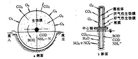 生物轉(zhuǎn)盤是利用微生物分解污水中的有機物來降低污水的COD和BOD,其原理是利用轉(zhuǎn)盤的轉(zhuǎn)動,使附著在轉(zhuǎn)盤上的微生物在水和空氣來回循環(huán)。在水中的過程微生物的氧化作用分解水中的有機物,而在空氣過程中微生物獲取空氣中的氧氣,用于氧化作用。通過不斷循環(huán)達到凈水目的。