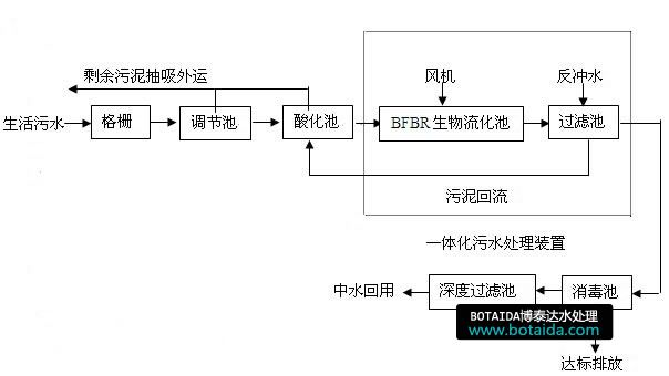 污水經(jīng)格柵后進(jìn)入調(diào)節(jié)池,進(jìn)行水力水量調(diào)節(jié),之后進(jìn)入酸化池酸化(兼有沉淀作用),然后進(jìn)入BFBR生物流化池進(jìn)行生物降解及氧化處理,并經(jīng)過濾池過濾,再經(jīng)過加氯消毒,即可達(dá)標(biāo)排放,若再經(jīng)過深度過濾處理,即可作中水回用。