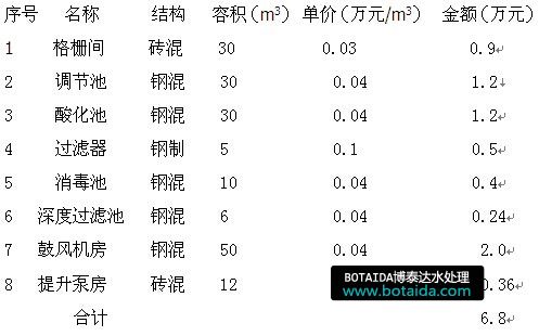 表4廢水處理工程土建工程費(fèi)用表