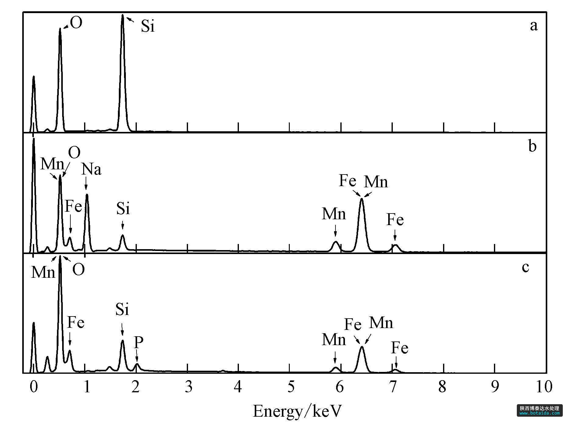 海砂與包覆海砂磷吸附前后的EDAX圖譜如圖 2所示. 海砂以硅元素與氧元素為主要成分,包覆鐵錳復合氧化物后,出現了明顯的鐵元素與錳元素的特征峰,表明鐵錳復合氧化物包覆在海砂的表面. 吸附磷后包覆海砂的EDAX圖譜又出現了磷元素的特征峰,表明鐵錳復合氧化物包覆海砂對溶液中的磷具有吸附性能.