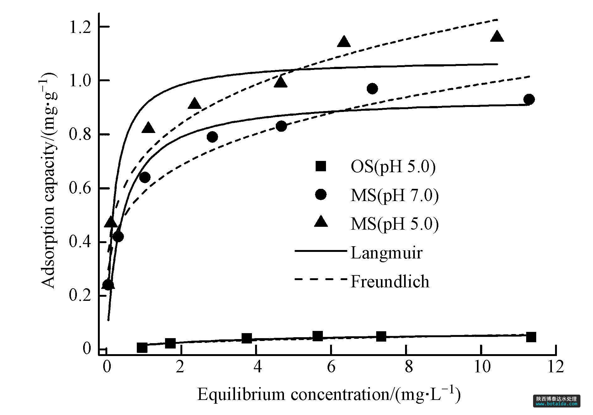 圖 3為海砂與包覆海砂在溶液pH為7.0與5.0條件下對磷的吸附等溫線. 海砂對溶液中磷的吸附能力很低,鐵錳復合氧化物包覆后海砂對溶液中磷的吸附明顯增強,吸附量隨著平衡濃度的升高逐漸增大,在低平衡濃度時吸附量增加較為迅速,當平衡濃度進一步增大,吸附量增加緩慢,趨于飽和.