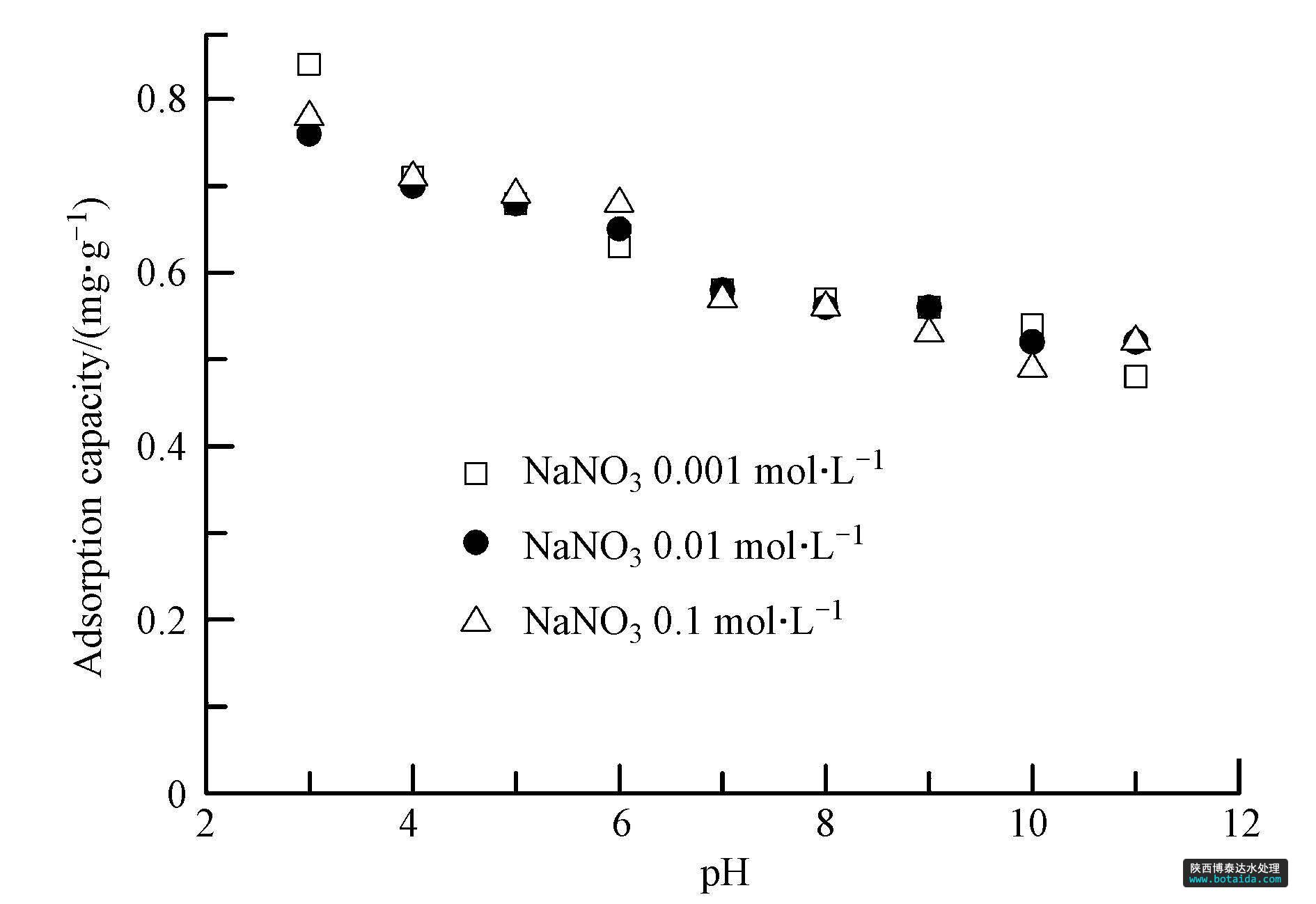 配制一系列50 mL濃度為5.0 mg · L-1磷溶液,分別投加200 mg吸附劑,考察不同pH(3.0~11.0)和不同離子強度(0.1 mol · L-1,0.01 mol · L-1,0.001 mol · L-1 NaNO3)對吸附磷的影響. 用HNO3和NaOH調節(jié)溶液pH,使pH穩(wěn)定在不同預定值.