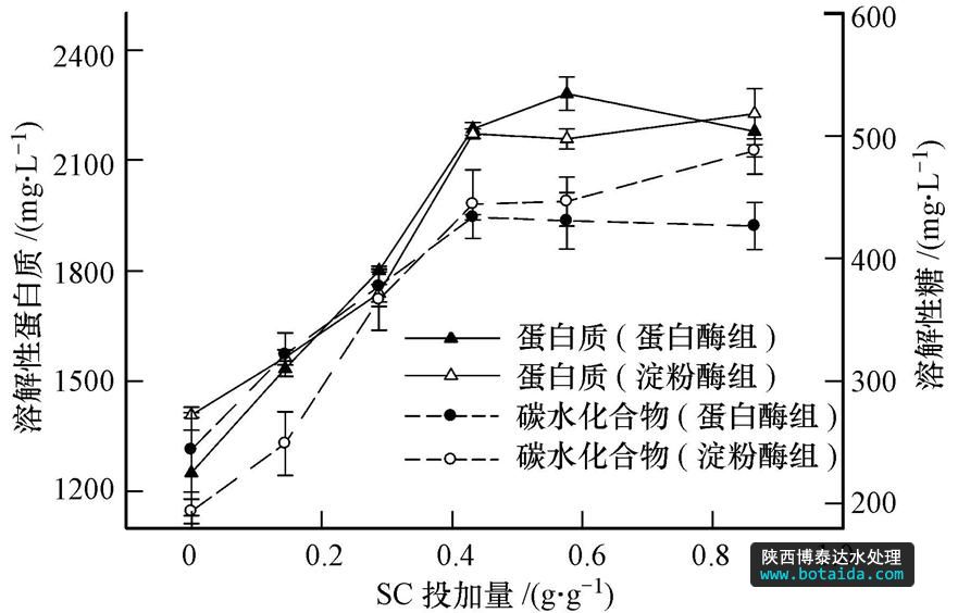 原污泥中的溶解性蛋白質(zhì)和碳水化合物濃度較低(溶解性蛋白質(zhì)73.0 mg · L-1,溶解性碳水化合物14.2 mg · L-1),表明其中的有機(jī)物主要以固體狀態(tài)存在,溶解性有機(jī)質(zhì)的含量較低.空白對(duì)照組(不加酶也不加SC)反應(yīng)4 h后,污泥中的溶解性蛋白質(zhì)和碳水化合物濃度分別增加至400.0和79.0 mg · L-1.在水解酶的作用下,隨著污泥膠團(tuán)的解聚和胞外聚合物的水解,大量有機(jī)質(zhì)由固相轉(zhuǎn)移至液相,成為溶解性物質(zhì).圖 1為蛋白酶和淀粉酶組實(shí)驗(yàn)(均投加酶0.06 g · g-1)在不同SC投加量下(0、0.144、0.288、0.432、0.576、0.864 g · g-1),反應(yīng)4 h后污泥中蛋白質(zhì)和碳水化合物濃度隨SC投加量的變化情況.由圖可知,只投加水解酶(不投加SC)時(shí),溶解性蛋白質(zhì)由原污泥的73.0 mg · L-1分別增加至1250.0 mg · L-1(蛋白酶組)和1407.0 mg · L-1(淀粉酶組),溶解性碳水化合物由原來的14.2 mg · L-1分別增加至244.0 mg · L-1(蛋白酶組)和194.0 mg · L-1(淀粉酶組).污泥的主要成分是蛋白質(zhì),此研究中淀粉酶和蛋白酶促進(jìn)污泥水解的效果差不多,其原因如下:一方面,Pinnekamp(1989)指出,碳水化合物和蛋白質(zhì)的可生物降解率分別為52.24%和39.70%,蛋白質(zhì)的可生物降解性較差,其水解在污泥水解過程中是限速步驟.在較短的時(shí)間內(nèi),碳水化合物的水解效率高于蛋白質(zhì).另一方面,EPS中碳水化合物可能與蛋白質(zhì)相結(jié)合,從而形成碳水化合物-碳水化合物、碳水化合物-蛋白質(zhì)、蛋白質(zhì)-蛋白質(zhì)相結(jié)合的結(jié)構(gòu),破壞其中任何一種物質(zhì),與其相結(jié)合的另一物質(zhì)也會(huì)隨之溶解出來(Sesay et al., .,2006).