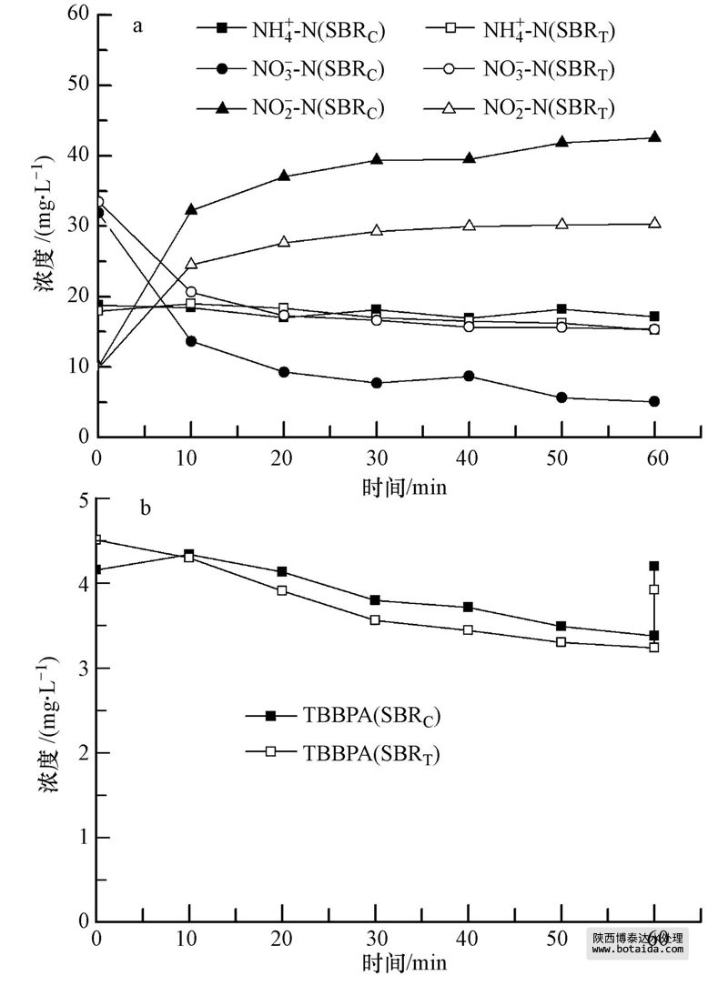 使用投加TBBPA馴化(SBRT)的活性污泥和未投加TBBPA馴化(SBRC)的活性污泥進(jìn)行硝化試驗(yàn).如圖 4a所示,由于硝化細(xì)菌對(duì)氨氮的硝化作用,NH+4-N濃度不斷減小,NO-3-N濃度不斷增加,同時(shí)有少量的NO-2-N生成.與周期試驗(yàn)結(jié)果一致,TBBPA對(duì)硝化細(xì)菌的活性沒有影響.圖 4b為TBBPA在硝化過程的去除.硝化過程TBBPA的濃度一直下降,然而在周期試驗(yàn)中好氧過程TBBPA的濃度在好氧階段一直上升.原因可能是在周期試驗(yàn)中除了生物降解外,pH對(duì)TBBPA的溶解度有較大的影響,TBBPA的濃度隨著pH的升高而上升,而硝化試驗(yàn)中TBBPA的濃度隨著pH的降低而下降.硝化過程中,對(duì)TBBPA的去除主要是NH+4-N作為電子供體,硝化細(xì)菌對(duì)TBBPA的生物降解作用,以及活性污泥對(duì)TBBPA的吸附作用.硝化過程結(jié)束,將pH調(diào)至初始值,TBBPA的濃度上升.原因可能是被活性污泥不穩(wěn)定吸附的TBBPA在較高pH條件下被釋放到溶液中.SBRC活性污泥對(duì)TBBPA的去除率為34.4%,其中生物去除占33.3%,吸附去除占1.1%.SBRT活性污泥對(duì)TBBPA的去除率為33.9%,其中生物去除占19.2%,吸附去除占14.7%.由此可見,TBBPA在硝化過程能夠被去除,Potvin等(2012)研究了TBBPA在好氧膜生物反應(yīng)器中的去除,發(fā)現(xiàn)硝化作用是生物降解TBBPA的一個(gè)關(guān)鍵過程.TBBPA的還原脫溴產(chǎn)物BPA也能夠被硝化細(xì)菌去除(Roh et al., 2009; Sun et al., 2012).可能原因是硝化菌能夠利用氨氮等作為電子供體,以TBBPA作為電子受體進(jìn)行生化代謝;抑或硝化菌某些生化代謝過程促進(jìn)了TBBPA的共代謝,此領(lǐng)域有待進(jìn)一步深入研究.