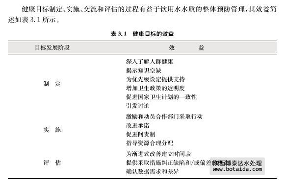 基于健康的目標(biāo)適用于各種發(fā)展水平的國家。為了確保有效保護(hù)和改善健康,設(shè)定的 目標(biāo)必須是現(xiàn)實的、可衡量的、基于科學(xué)的數(shù)據(jù)并與當(dāng)?shù)貤l件(包括經(jīng)濟(jì)、環(huán)境、社會和文化 條件)以及財政、技術(shù)和體制資源相適應(yīng)。健康目標(biāo)應(yīng)是整體公共衛(wèi)生政策的一部分,應(yīng)將 公眾衛(wèi)生現(xiàn)狀和趨勢、飲用水對于傳染性疾病傳播和有害化學(xué)品在個體水平和整個衛(wèi)生管 理中的作用考慮在內(nèi)。