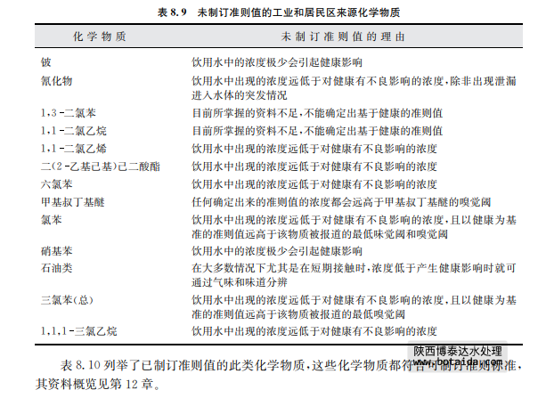 表8.9列舉了尚未制訂準(zhǔn)則值的來源于工業(yè)和居民區(qū)活動的化學(xué)物質(zhì),并在表中說明 了理由,其資料概覽見第12章。