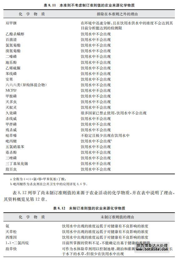 由于一些關(guān)于飲用水中存在化學物質(zhì)以及其穩(wěn)定性的文獻有明顯證據(jù)指出某些農(nóng)業(yè) 來源的化學物質(zhì)不會出現(xiàn)在飲用水中,對于此類化學物質(zhì)本準則不考慮建立準則值(見表 8.11)。