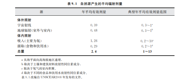據(jù)聯(lián)合國輻射效應(yīng)科學(xué)委員會估計(UNSCEAR,2008),全球每人接受來自環(huán)境中所有 放射源的年平均劑量約為3.0mSv/年(物理量解釋見專欄9.1)。其中,80%(2.4mSv)來自 自然源,19.6%(接近0.6mSv)來自醫(yī)療診斷輻射,而剩下的0.4%(約0.01mSv)來自于其 他人工源(見圖9.1)。對于整個人群,每個人所接受的輻射劑量變化很大,取決于居住地點、 飲食規(guī)律和生活方式等因素。個人輻射劑量也可能因醫(yī)療暴露和職業(yè)暴露而不同。表9.1 列出了年平均劑量和天然來源個人輻照劑量的典型范圍(UNSCEAR,2008)。