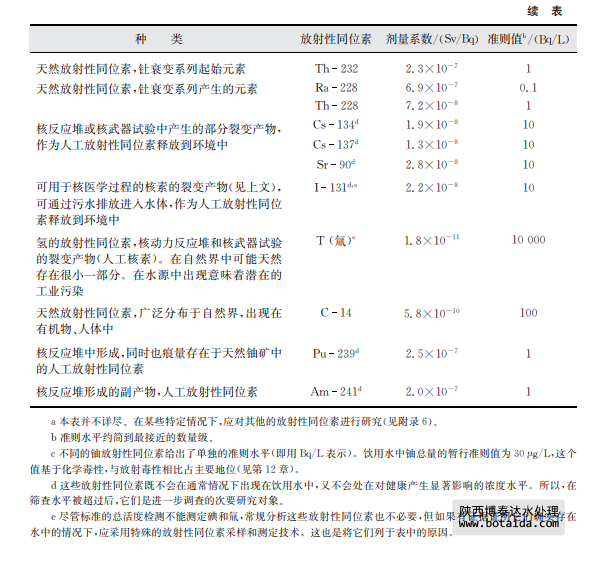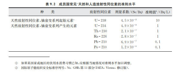 從放射學(xué)的角度,超過準則值的程度也是一個需要考慮的關(guān)鍵問題。防護電離輻射和輻 射源安全的國際基本安全標準在有關(guān)現(xiàn)有暴露的章節(jié)提到了飲用水并提出由使用飲用水帶來 的個人年最高輻射劑量最大不能超過約1mSv②。這一水平不應(yīng)被當作“可接受的”水平或限 制性水平,并應(yīng)盡可能地采取有效措施減少受到的輻射水平。每種超過準則水平的情況不同, 在做出最后的決定之前還需要考慮一些非放射方面的因素(如補救措施的經(jīng)濟成本、其他供水 源的實用性)。政府的有關(guān)部門應(yīng)意識到,放射性同位素(如鈾)同時具有化學(xué)毒性,那么在水 中的允許濃度可能需要以其同位素的毒性確定,而不是依據(jù)放射性(見第12章)。