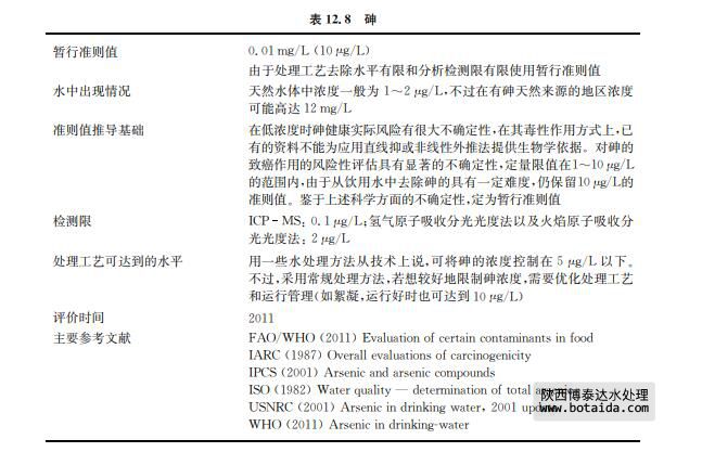 砷的實際定量極限是1~10μg/L,并且在許多情況下去除砷到達(dá)10μg/L以下的水平 非常困難。由于實際飲用水工藝中(尤其供水規(guī)模較小情況下)去除砷十分困難,以及定量 的檢測限水平較高,將10μg/L保留作為濃度控制目標(biāo)和暫行準(zhǔn)則值。