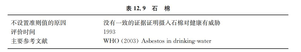 水中的石棉來(lái)自含石棉的材料和礦石在水中的分解,也來(lái)自工業(yè)排放物以及大氣污染 和供水系統(tǒng)中的石棉 水泥管道。石棉纖維從石棉 水泥管剝落可對(duì)水的供應(yīng)造成威脅。有 限的資料顯示,在淋浴或空氣潮濕時(shí),從自來(lái)水釋放到大氣的石棉暴露量可以忽略不計(jì)(見 表12.9)。