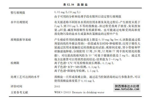 溴酸鈉和溴酸鉀是強氧化劑,主要用于燙發(fā)中和劑和硫化染料紡織品的染色。雖然 JECFA已經做出規(guī)定(見表12.16),在食品加工中不宜使用溴酸鉀,它還是被用作氧化劑來對研磨中的面粉催熟,也用于啤酒制造處理大麥以及用于魚醬產品生產。溴酸鹽在水中通 常不存在,但可能存在于工業(yè)污染源中。有時來自于土壤污染。不過,其主要的來源是當水 中含溴離子時,飲用水的臭氧化過程中形成溴酸鹽。電解含溴化物的鹽時,也可能在次氯酸 鹽溶液中生成溴酸鹽。