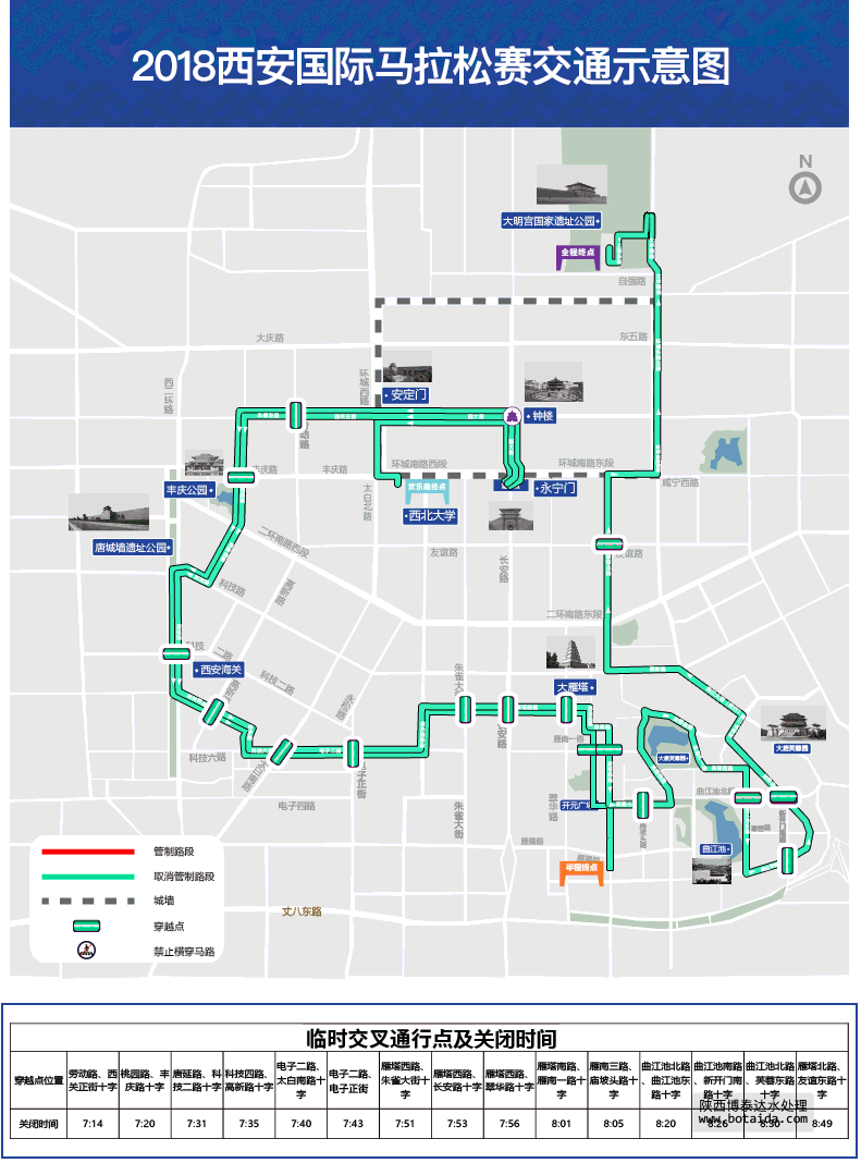 此次西安國(guó)際馬拉松的3項(xiàng)比賽起點(diǎn)均設(shè)在永寧門(mén),為配合大賽舉辦,根據(jù)組委會(huì)要求,比賽當(dāng)日地鐵二號(hào)線(xiàn)永寧門(mén)站將延遲至上午10點(diǎn)開(kāi)站,自地鐵運(yùn)營(yíng)開(kāi)始至10時(shí),列車(chē)在永寧門(mén)站不停站通過(guò),前往永寧門(mén)站的乘客可從相鄰的鐘樓站或南稍門(mén)站進(jìn)出車(chē)站,由此給廣大乘客出行帶來(lái)的不便,請(qǐng)大家給予理解與支持。