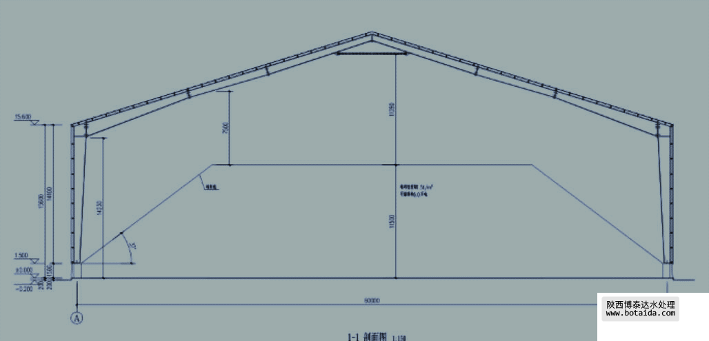 輔料堆棚項目長約 40米,寬 24 米,高 9.6 米的料倉。沿中心點兩側(cè)做兩條約 40 米長的噴霧降塵點,共計約 80 米。