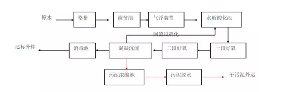 水處理系統(tǒng)由調(diào)節(jié)池、缺氧池、好氧池(接觸氧化池)、二沉池組成。來(lái)自生產(chǎn)車(chē)間的污水自流入調(diào)節(jié)池,調(diào)節(jié)池入口設(shè)機(jī)械格柵,以攔截大顆粒狀和纖維狀雜質(zhì),在調(diào)節(jié)池中污水充分地混合,調(diào)節(jié)水量并初步降解有機(jī)物,然后通過(guò)污水泵將污水輸入氣浮池,去除油污,懸浮物進(jìn)入缺氧池,在缺氧池中回流混合液與原污水充分混合,通過(guò)兼氧微生物的作用,將亞硝酸氮和硝酸氮轉(zhuǎn)化為氮?dú)?,完成反硝化脫氮,缺氧池出水自流入接觸氧化池。接觸氧化池是一種以生物膜法為主,兼有活性污泥法的生物處理裝置,通過(guò)鼓風(fēng)機(jī)提供氧源,使污水中的有機(jī)物與池內(nèi)生物膜充分接觸,經(jīng)微生物吸附、降解作用,使水質(zhì)得到凈化。二沉池出水進(jìn)入混凝沉淀,進(jìn)一步去除污染物,使出水達(dá)標(biāo)排放。